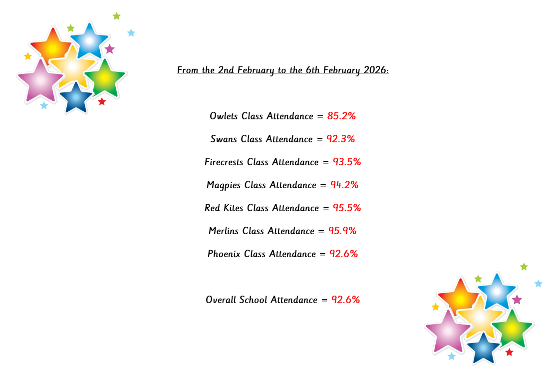 Congratulations to Archie for winning the £5 gift card for having 100% attendance for the whole week. Congratulations to Merlins Class for having the best attendance of the week.